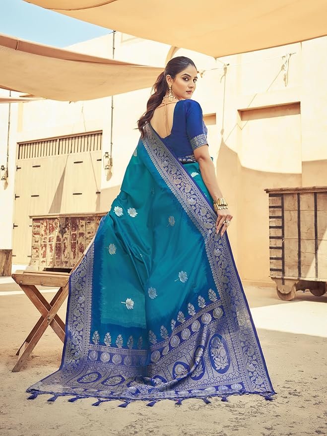 The fabric drapes beautifully over the body, enhancing your silhouette with a regal and graceful appeal. Inspired by traditional Kanjivaram and Banarasi craftsmanship, this saree reflects timeless Indian artistry while maintaining a contemporary touch.