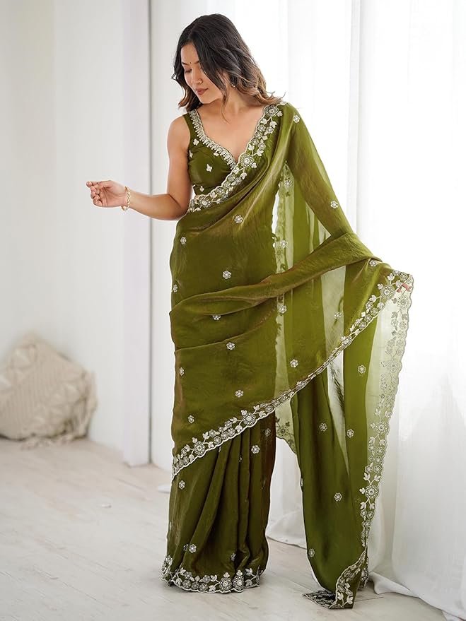 The saree is beautifully designed in a rich mehndi green color, complemented by intricate sequins embroidery that adds a touch of sparkle and glamour. The scalloped border detailing further enhances its designer appeal, making it a standout piece for special occasions.