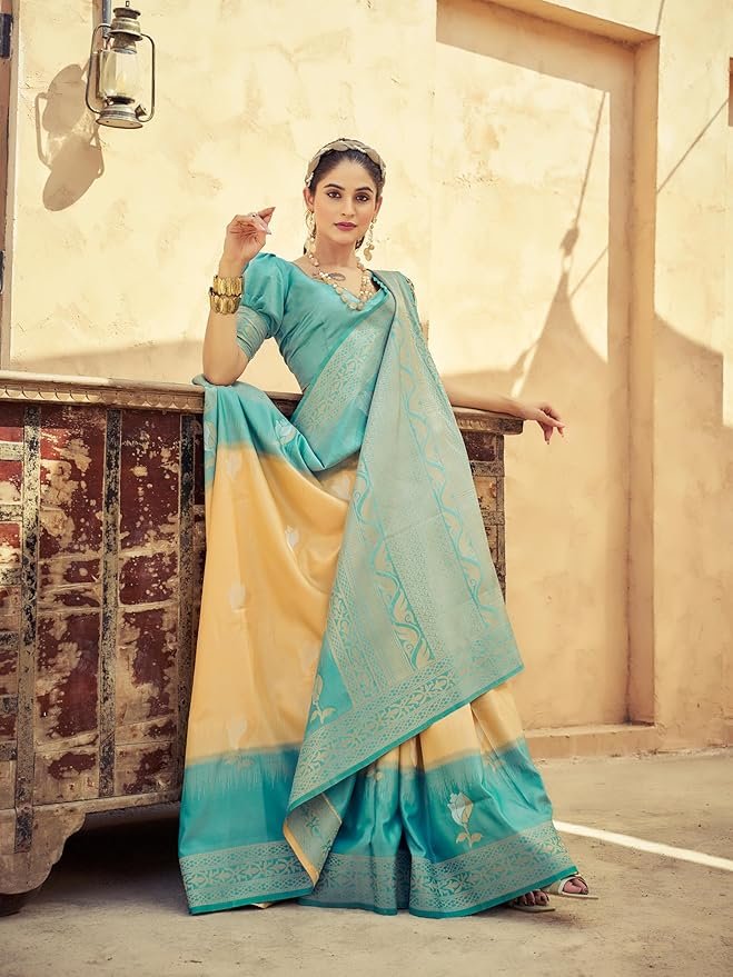 Inspired by the richness of Kanjivaram and Banarasi weaving traditions, this saree beautifully blends classic craftsmanship with modern fashion trends. Its refined design makes it suitable for a variety of occasions, including weddings, festive celebrations, ceremonies, and casual ethnic wear.