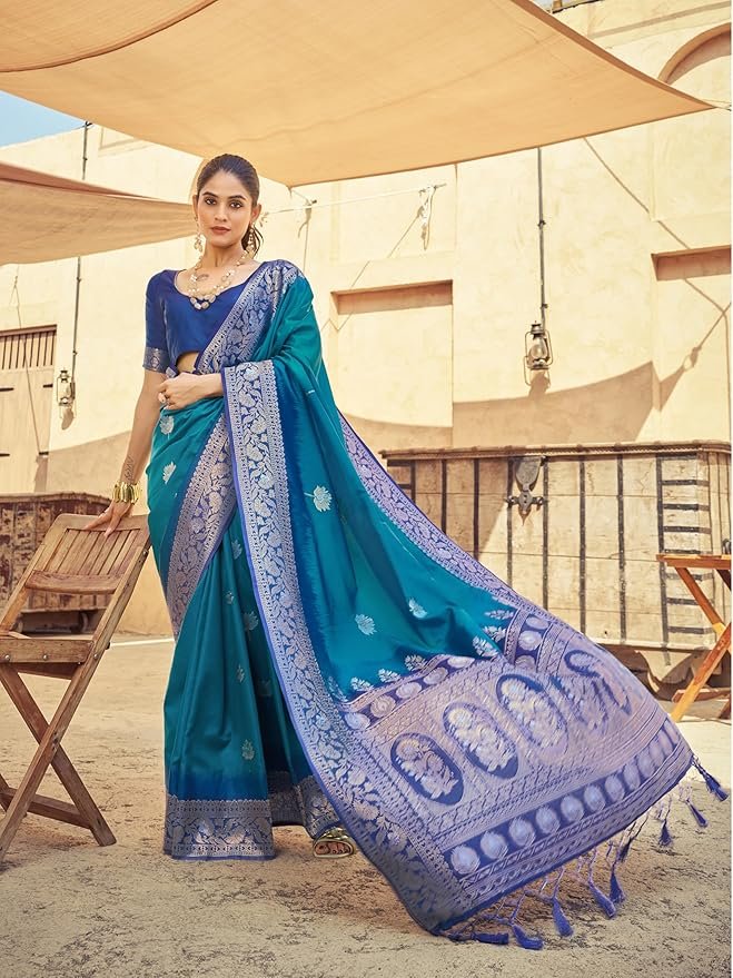 The fabric drapes beautifully over the body, enhancing your silhouette with a regal and graceful appeal. Inspired by traditional Kanjivaram and Banarasi craftsmanship, this saree reflects timeless Indian artistry while maintaining a contemporary touch.