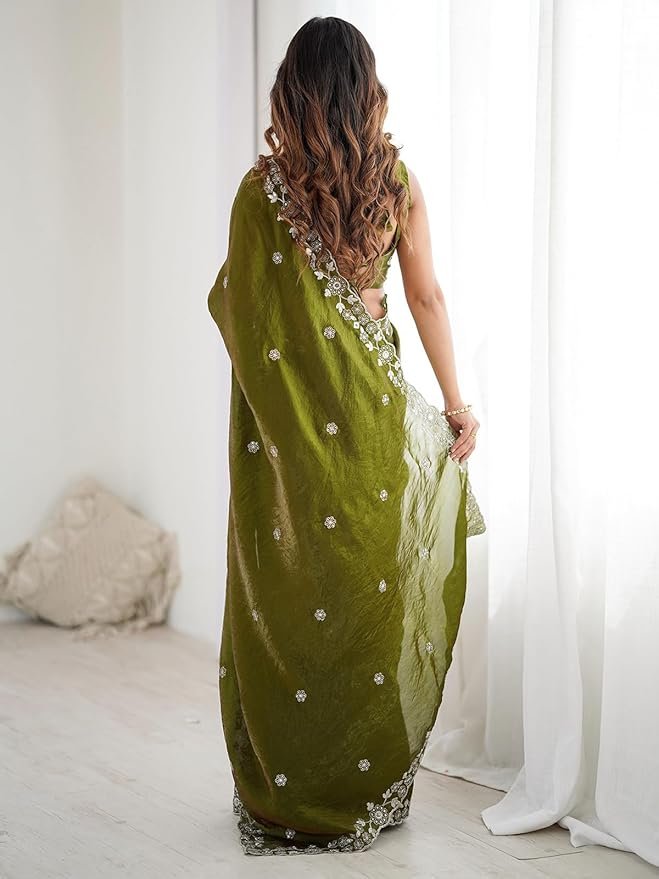 The saree is beautifully designed in a rich mehndi green color, complemented by intricate sequins embroidery that adds a touch of sparkle and glamour. The scalloped border detailing further enhances its designer appeal, making it a standout piece for special occasions.